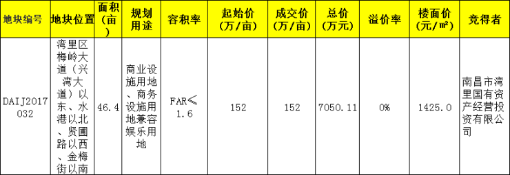 12月27 日,南昌湾里区一宗商业设施用地、商务设施用地兼容娱乐用地成功拍卖。南昌市湾里国有资产经营投资有限公司以底价将该地收入囊中,面积共46亩,152万元/亩,总价共7050万元,合计楼面价1425元/平米。